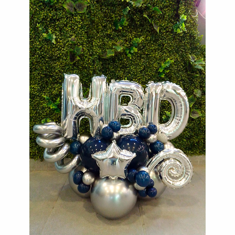Bouquet para cumpleaños con globos de aluminio en frase HBD de 16”, en base de globos R12-R9, combinación de tonos mate y cromado.