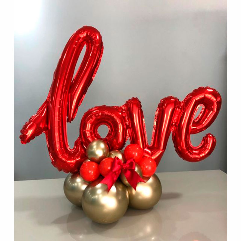 Bouquet para amor, aniversario o boda con globo de aluminio de frase de 29”, sobre base de globos de látex cromados y acentos en globos R5 fashion. Altura aproximada de 70 cm.